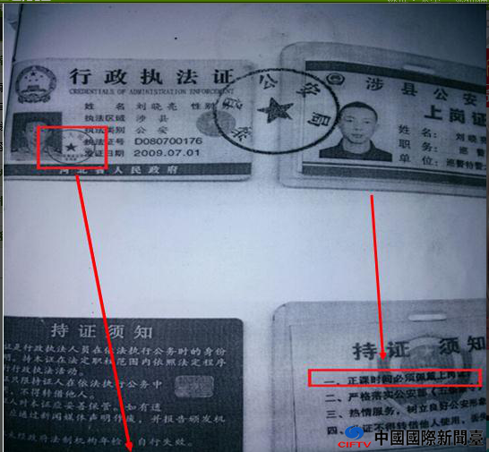 2、巡防队员到达案发现场后并未出示人民警察证及相关执法证件,侦查卷中证人王志永等人的上岗证系涉县公安局私自印发并非公安部制发的人民警察证,不能证实出警人员具有人民警察身份,执法证件也并非河北省人民政府颁发。巡防队员根本不具有出警主体资格及执勤、执法资格。