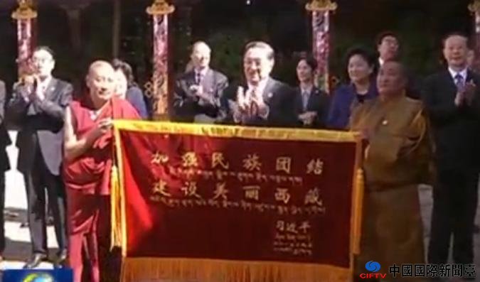 俞正声向大昭寺赠送了习近平亲笔题写的“加强民族团结建设美丽西藏”贺幛