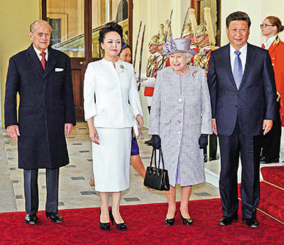 习近平夫妇登上皇家检阅台,伊丽莎白二世女王和丈夫菲腊亲王迎接。仪仗队敬礼,军乐队高奏中国国歌。在菲腊亲王陪同下,习近平检阅了仪仗队。