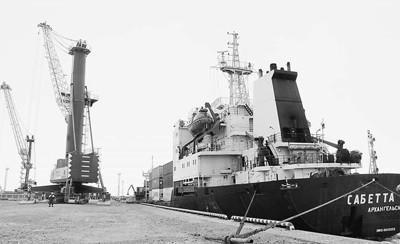 经由北极航线运抵亚马尔的施工模块在萨别塔港进行卸装。