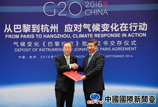 9月3日,国家主席习近平向潘基文交存中国气候变化《巴黎协定》批准文书。新华社