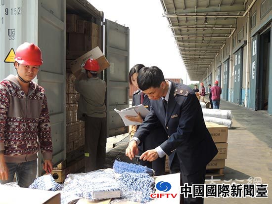 图:广州南沙检验检疫人员在查验出口货物/大公报记者黄宝仪摄