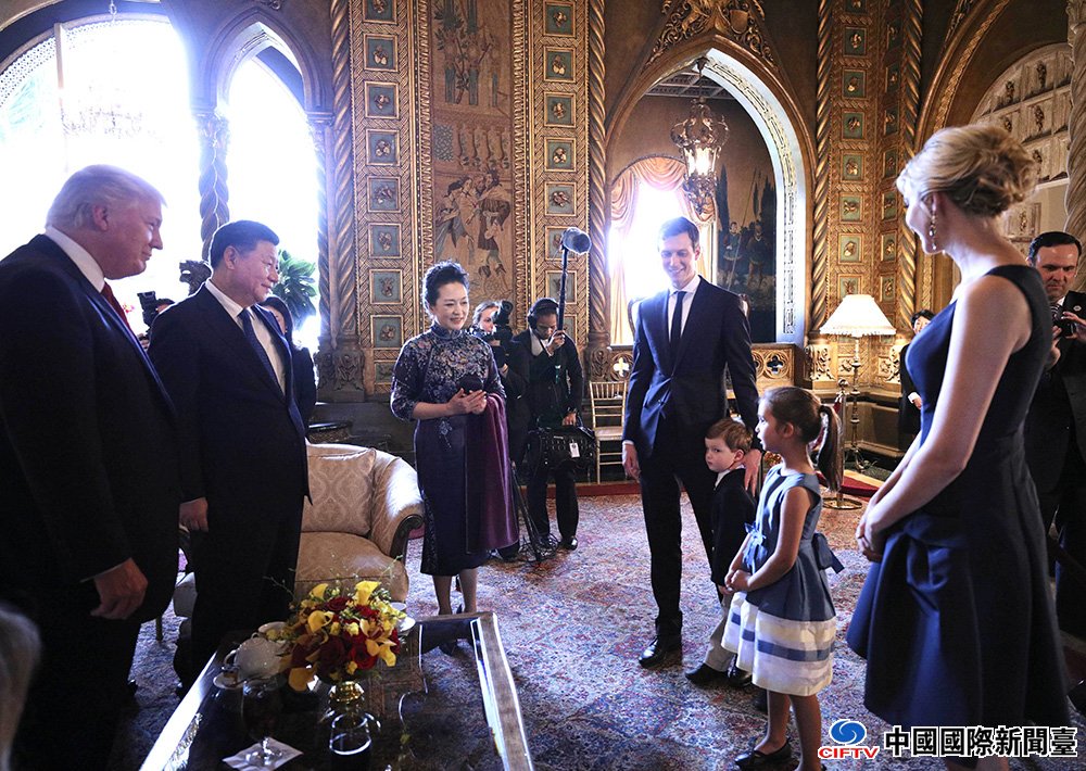 图:国家主席习近平和夫人彭丽媛一行于当地时间6日下午飞抵美国佛罗里达州,在海湖庄园和美国总统特朗普举行中美元首会晤。图为两国元首夫妇共同欣赏特朗普外孙女和外孙演唱中文歌曲《茉莉花》并背诵《三字经》和唐诗\新华社