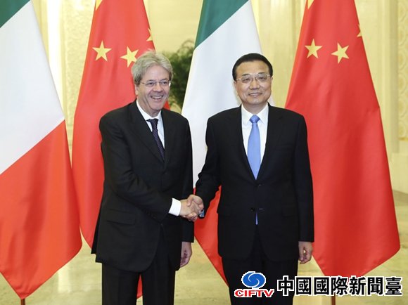 李克强与意大利总理真蒂洛尼亲切握手(新华社 庞兴雷 摄)