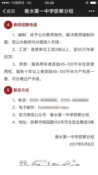 这并非衡水一中邯郸分校首次公开招聘。早在今年1月5日,衡水一中邯郸分校即在当地媒体发布招聘启事。不过,此次招聘中,教师年薪被定为6万至30万元,此外另有免费教师公寓,子女免费进入衡水第一中学邯郸分校就读等福利。