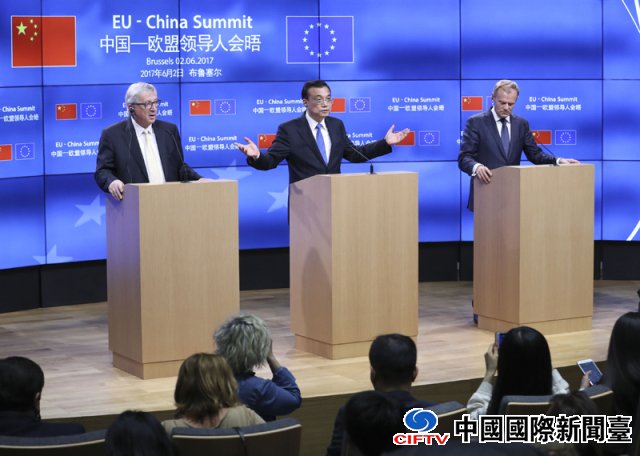 李克强总理出席第十九次中欧领导人会晤,并与欧洲理事会主席图斯克、欧盟委员会主席容克共同会见记者。