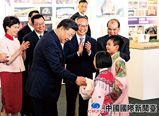 习近平在西九文化区与演唱粤剧选段的两名儿童亲切交谈