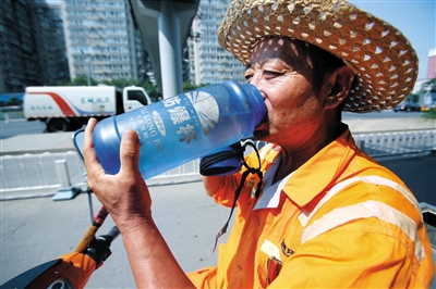昨日下午2时许,广渠门内大街,一名东城环卫工人在高温下喝水解暑。 新京报记者 王贵彬 摄