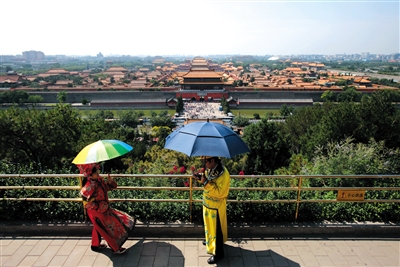 昨日,景山山顶,有游客穿着厚重的“皇上”和“皇后”的服装,撑起伞拍照。 新京报记者 薛珺 摄