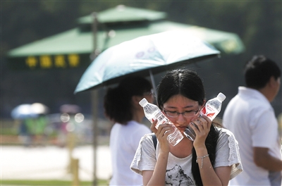 昨日下午,天安门广场,一名女孩用两瓶冰水敷脸降温。 新京报记者 浦峰 摄
