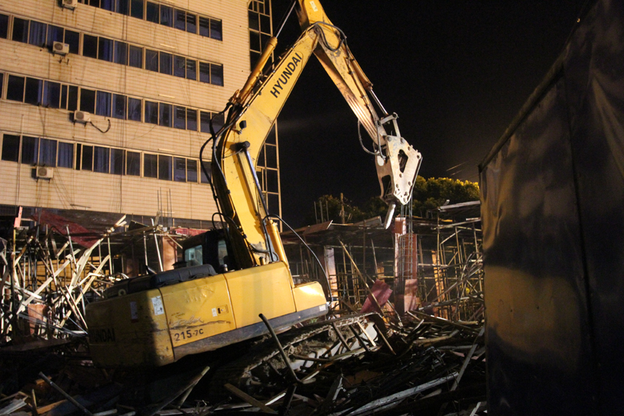 当晚8时许,市、区查违办、黄州赤壁办事处、市国土、城管、公安、交警、电力、卫生等百余名人员进入拆违现场,按照既定分工采取行动。在清理无关人员离场,限制周边交通后,施工机械和人员进场。随着机械轰鸣,到晚上10时30分,该处违法建设被全部推倒拆除。