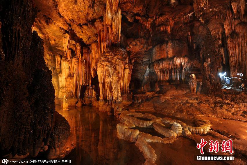 2015年07月14日,湖南省临武县,花塘乡石门村龙洞内,一条鳞甲分明、栩栩如生的“石龙”弯曲着深潜水底,令人称奇。经专家测量,“石龙”长13米多,粗0.6米至0.8米。所在的“龙池”,面积近百平方米,高约5米,宽处6米,长约30米。地质学家说,从当地海洋变陆地的地质演变史来推测,“石龙”的形成大概有上亿年的时间。郭立亮 摄 图片来源:CFP视觉中国