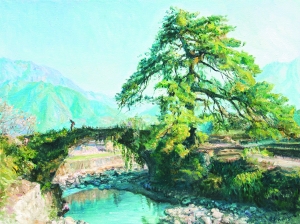 经历岁月洗礼的石拱桥横跨小河两岸,桥上的石板结着墨绿的青苔,苍翠的枝条顺着桥身垂挂下来,午后的微风将乡间的惬意荡漾在安静的河面上。年迈的松树守在桥的一头,叶片有些稀疏但依然能够成荫。远处群山叠嶂,与蓝天交织。那桥面上背柴的老人,弯曲着脊背,承载着生活的重量,走向归家的路。这就是朱利民的油画《慕仙桥》——用细腻的笔触,明快的色彩,描绘着江山市保安乡慕仙桥的生态之美,把人带入了一个远离喧嚣、静谧温馨的美好世界。