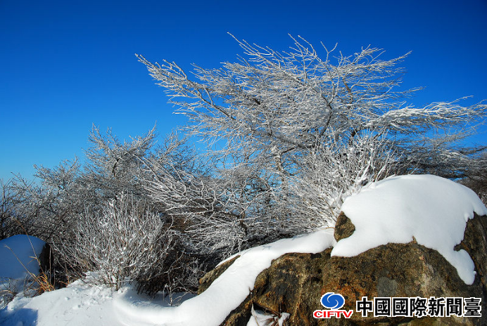 古老的山石和年轻的劲松,穿上了今年冬天的第一件白色新装。
