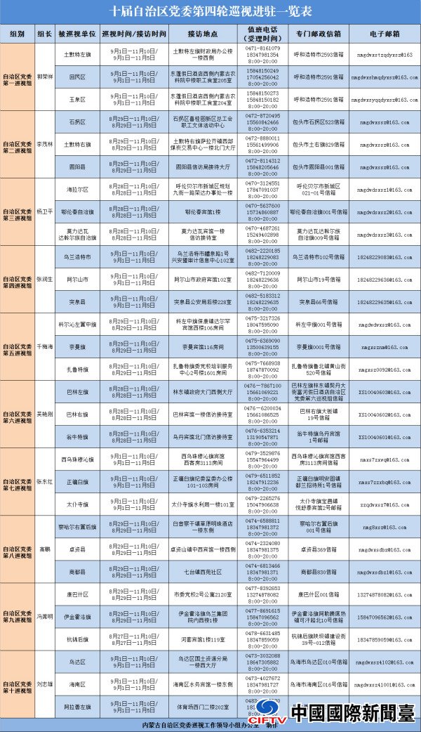 经内蒙古自治区党委批准,十届党委第四轮巡视共派出10个巡视组,对呼和浩特市土默特左旗等30个旗县(市区)开展巡视。截至8月31日,自治区党委巡视组已全部进驻30个旗县(市区)并展开巡视工作。