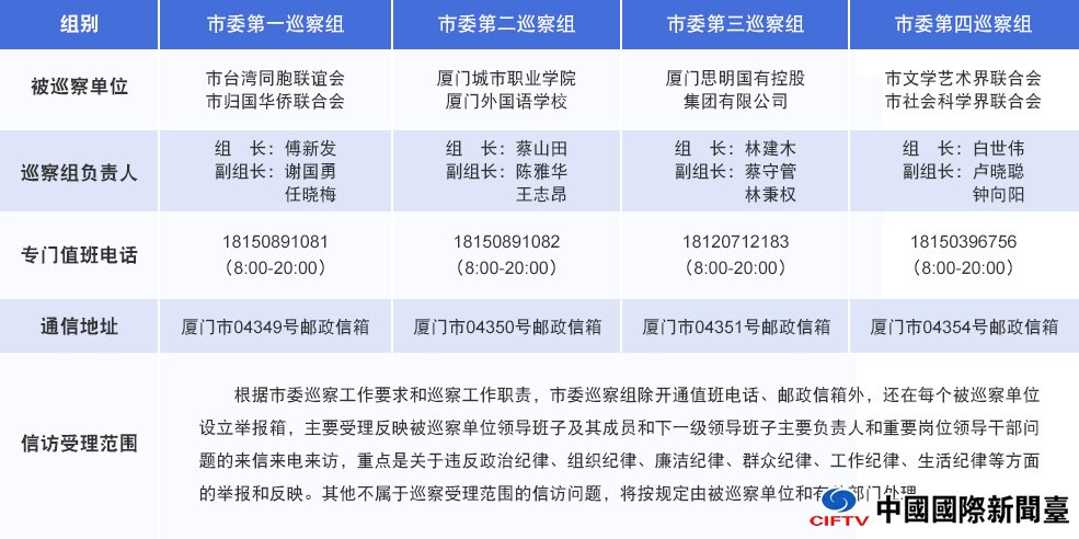 根据《中国共产党巡视工作条例》《关于市县党委建立巡察制度的意见》以及福建省委、厦门市委相关规定和部署要求,经厦门市委巡察工作领导小组研究决定,厦门市从2018年12月12日起启动十二届市委第九轮第二批巡察工作,对厦门城市职业学院、市文学艺术界联合会、市社会科学界联合会、市台湾同胞联谊会、市归国华侨联合会、厦门思明国有控股集团有限公司、厦门外国语学校等单位党组织开展巡察,巡察时间40天左右。日前,四个巡察组已经进驻被巡察单位。