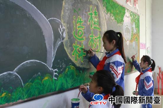 在福建省福鼎市的校园里,孩子们正认真制作“植树造林”主题黑板报,用手中的画笔宣传“爱绿、植树、护绿”的理念。(孙金瑞 摄)