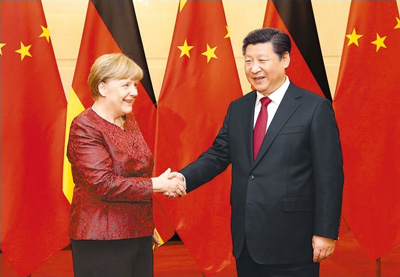 习近平欢迎默克尔担任总理以来第八次访华,指出中德两国领导人保持密切交往体现了两国关系的高水平发展。中德关系关乎两国人民福祉,也关乎中欧合作乃至世界经济发展。两国发展全方位战略伙伴关系,既要立足双边,也要放眼中欧、亚欧乃至全球。双方要巩固政治互信,尊重彼此发展道路,理解和照顾彼此核心利益和重大关切,保持各层次密切交往势头。《中德合作行动纲要》已经产生积极成效。双方要进一步挖掘合作潜力,培育更多合作增长点,推动财政金融、城镇化、农业、电动汽车、节能环保、智能制造和生产网络化等领域合作不断取得新进展。中方欢迎德方参与中国中西部地区发展和东北老工业基地改造,欢迎德国担任2016年中国西部博览会主宾国。中德在文化、教育、体育、医疗卫生、社会保障、残疾人事业等众多领域合作空间广阔。中方支持双方明年共同举办中德青少年交流年。