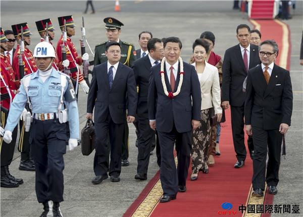 图为2013年10月2日,习近平抵达雅加达开始对印度尼西亚进行国事访问。(马占成摄)