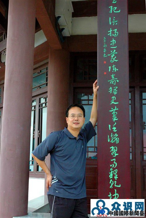 在西山开汉楼自己书法作品前留影。