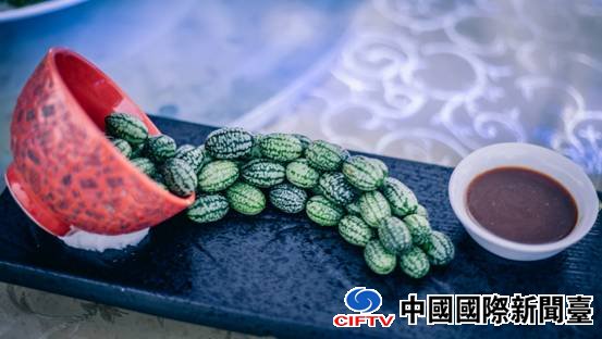这道“硕果累累”的菜肴,将西瓜瓤裹上面粉,经过油炸,撒上芝麻做成葡萄的形状,再将瓜皮雕刻成葡萄叶子,一串色香味俱佳的美食就呈现在了大家面前。