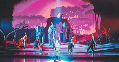 四是“偶”象的戏剧内涵。毫无疑问,木偶剧主要是凭借“偶”的设计、制作与表演技艺来完成艺术形象塑造的。《最后一头战象》大象与小象的精心呈现令观众为之惊叹,最出彩的部分是象鼻子,剧中表现内心世界的动作都是用鼻子完成的。譬如波农丁想帮嘎羧把它脚掌上的钉子拔出来,母象不明就里,一再排斥波农丁;波农丁毫不畏惧,一再上前。其中,母象的“排斥”,除了叫声,都是用鼻子的卷、舒、摇、摆、扫、举、劈来表现的。于是,编导在这里精心设计了以母象鼻子为动作辐射源的舞蹈动作:大约4人操作象鼻子的动作,另有两人托举波农丁,他们之间的每一次撞击或卷起甩出,都是有节奏有造型的立体舞蹈,甚至有时是“慢镜头”表演,惊险而优美。小象嘎羧的鼻子扬起或摇摆,也与波农丁的友好戏弄相互呼应,仿佛在尽情享受爱的抚弄。由此可以看出,木偶的制作与表演不仅仅要追求外形相仿,更要在戏剧冲突中揭示内心世界。