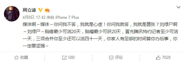 中国国际新闻台(www.ciftv.com)讯 周立波在美国开车携带枪支毒品案还未有最终结果,法庭外却又与律师刘龙珠产生摩擦。日前,周立波发微博将“刘律师”写成“刘绿尸”,被要求删除微博并公开道歉。今天(6月10日),周立波再次发文公开怼律师,言语极其讽刺。