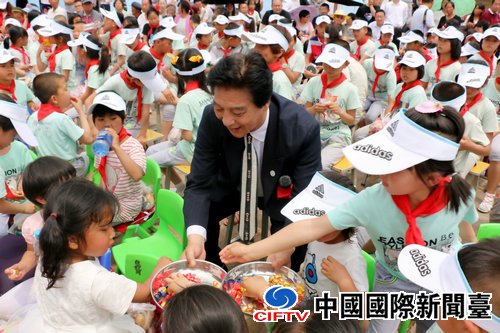 著名歌唱家金波将自己的矿泉水送给残疾儿童