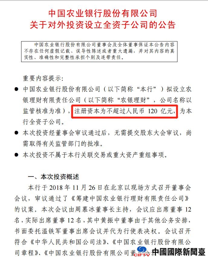 而在工行发出设立银行子公司的1个小时前,农业银行刚发布公告,拟出资不超120亿元投资设立农银理财有限责任公司(简称农银理财,名称以监管核准为准)。