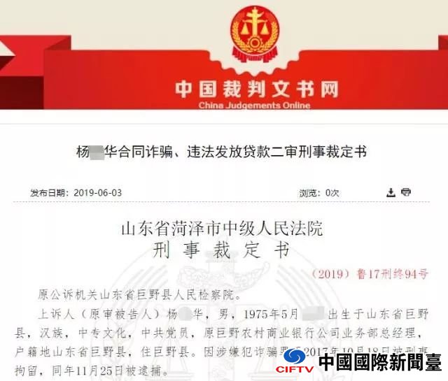 裁定书同时披露,除了上述合同诈骗外,杨某华还涉及违法发放贷款。杨某华自2016年3月至2017年9月,身为巨野农商行公司部总经理,贷款主要责任人,违反信贷调查的国家规定,违法发放贷款五次,合计人民币1.86亿元。