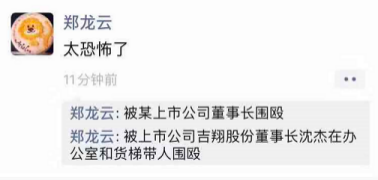 10月17日午后,天风证券原研究员郑龙云在个人朋友圈发布消息称:“太恐怖了,被上市公司吉翔股份董事长沈杰在办公室和货梯带人围殴。”