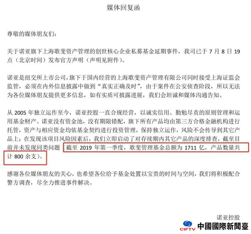 诺亚财富还发了一份《媒体回复函》,上面显示,关于诺亚旗下上海歌斐资产管理的创世核心企业私募基金延期事件,公司已于7月8日19点(北京时间)发布官方声明,发现该项目风险因素后,立即启动了对存续期内其它产品的深度排查,截至目前并未发现同类问题(截至2019 年第一季度,歌斐管理基金总额为1711亿,产品数量共计800余支)。诺亚财富将积极配合警方调查,尽全力推进事件解决。