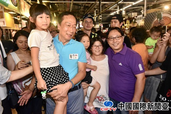 中国台湾网6月9日讯 据台湾“东森新闻云”报道,台湾鸿海集团董事长郭台铭,为参加国民党2020初选争取民众支持,8日继续北台湾夜市行程,拜访新店区安和国际夜市并发放福袋,受到摊商和当地民众的热情接待。民众扶老携幼前来合影,郭台铭来者不拒通通将小孩一把抱起展现亲民作风。亲切的郭台铭点了200元(新台币)平民小吃,并率领民众向蔡当局呛声高喊“人民不能再忍耐另一个4年了”!