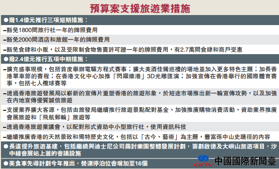 财政司司长曾俊华昨日宣布,监于本港旅游业最新形势,将会为旅游及相关行业推出共涉及1.4亿元的三项短期措施,包括豁免1800间旅行社、2000间酒店及旅馆一年的牌照费用;以及豁免食肆和小贩,以及受限制食物售卖许可证一年的牌照费用,将会有2.7万间食肆和商户受惠。旅议会总干事董耀中欢迎宽减业界牌费,认为可令业界直接受惠。