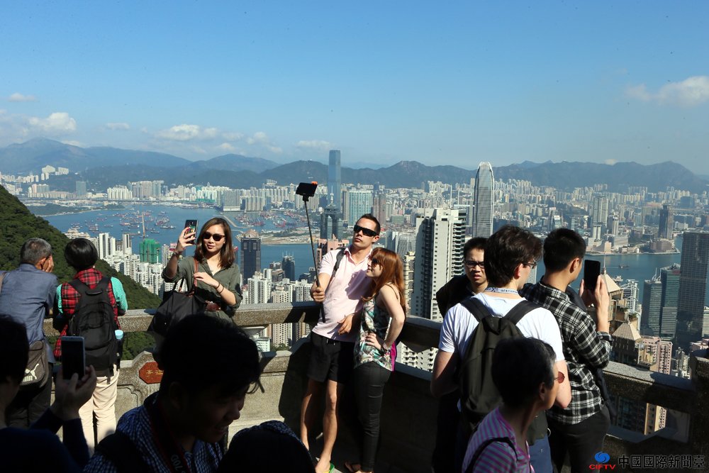 图:政府将减轻旅游业界经营成本,并加强本港的吸引力。图为游客在太平山顶饱览维港风光 新华社