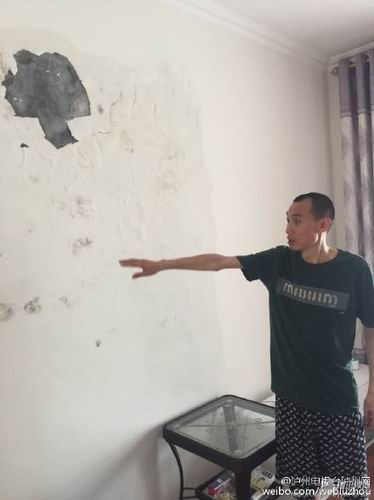 住户黎亚陵告诉记者:我们搬进来一年半了,每到下大雨,最先就是这一处浸,后来第二次下雨就越浸越恼火,就像水帘洞一样渗水,开头是这方,现在这方都在浸水,两面都在浸水,买套房子确实不容易,都是东凑西凑的,现在成了烂房子就没有意思了。