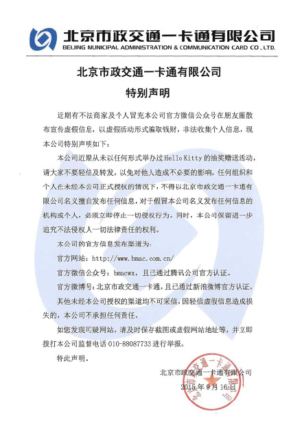 16日下午,“北京市政交通一卡通”官方微博发表声明,称公司近期从未以任何形式举办过HelloKitty的抽奖赠送活动,任何组织和个人在未经本公司正式授权的情况下,不得以北京市政交通一卡通有限公司名义擅自发布任何信息,对于假冒公司名义发布任何消息的机构或个人,必须立即停止一切侵权行为。