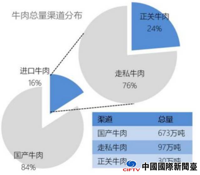 根据MIG集团的研究报告,2014年,中国市场上通过正规关税渠道进口的牛肉大约为30万吨,但走私牛肉高达97万吨,占全部进口牛肉份额的76%。