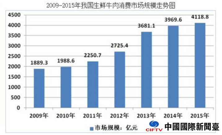 中国的牛肉市场规模在2010年以后开始呈现出井喷状态。中经先略的报告显示,2015年,中国的生鲜牛肉消费规模达到4118.8亿元,超过了2010年时的两倍。这其中进口牛肉也占据了很高比重。据北京青年报消息,中国去年牛肉进口量达到82.5万吨,金额约26亿美元。而2003年,全年牛肉进口量仅为1500万美元,相差173倍!