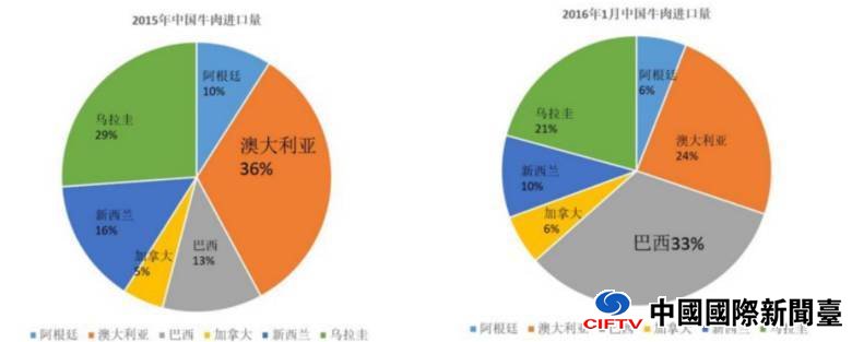 根据MIG集团数据,2016年1月,巴西成为中国最大的牛肉来源国,份额从2015年的13%猛增至33%,而澳大利亚退居第二。
