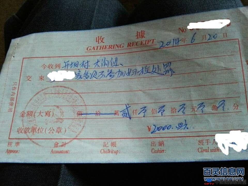 (图为新发乡开坪党工委开具的未参加妇检的罚款收据)