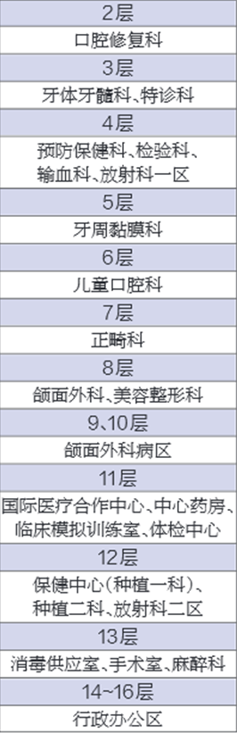 一楼是门诊大厅,分布着挂号处、收费处、住院结算处、门诊药房、放射科、急诊科。二楼口腔修复科;三楼牙体牙髓科、特诊科;四楼预防保健科、检验科、输血科、放射科一区;五楼牙周粘膜科;六楼儿童口腔科;七楼正畸科;八楼颌面外科、美容整形科;九楼、十楼为颌面外科病区;十一楼国际医疗合作中心、中心药房、临床模拟训练室、体检中心;十二楼保健中心(种植一科)、种植二科、放射科二区;十三楼是消毒供应室、手术室、麻醉科;十四到十六楼为行政办公区。