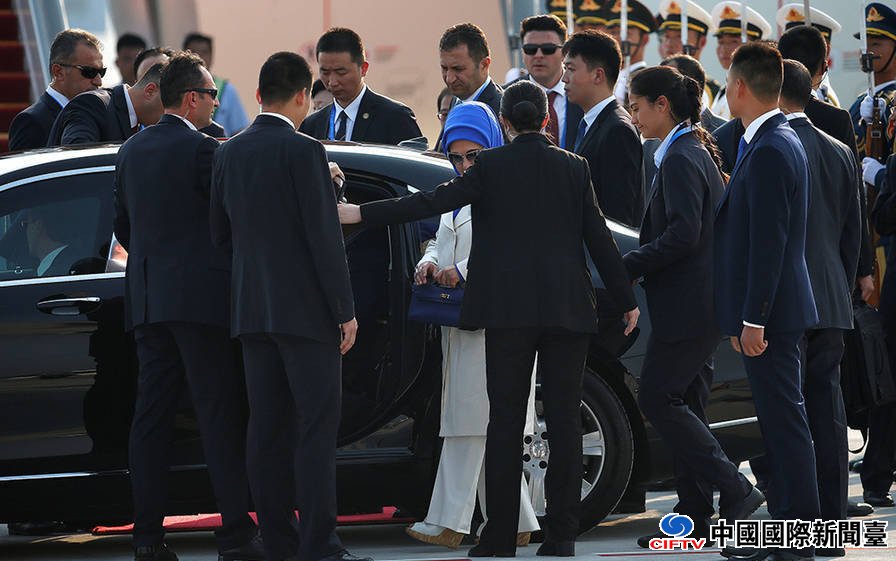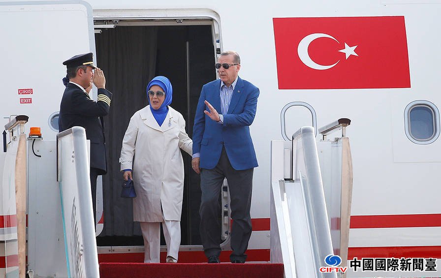土耳其总统埃尔多安与妻子Emine Gulbaran抵达萧山国际机场。