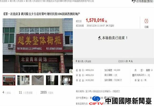 中国国际新闻台(www.ciftv.com)记者 顾宝军 通讯员李忠 万筱报道:2016年12月26日,潢川县人民法院驻淘宝网司法拍卖频道聚集了近3000人次网民的围观,历时近80分钟共24次的延时,4名竞拍人经过144轮的激烈竞价,最终将评估价格仅85.6万的房产定格在157万的高成交价成交,该拍卖品溢价率近90%。至此,该院在岁末年尾又成功执结一起矛盾尖锐的民间借贷案件。