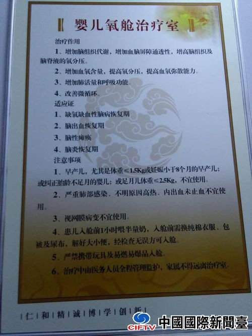 张贴在南阳市张仲景国医院康复科婴儿氧舱治疗室门口的资料牌