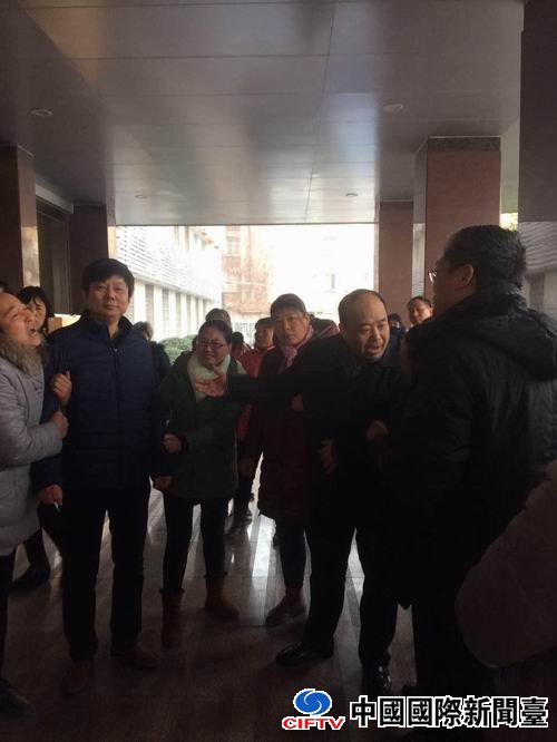 南阳市张仲景国医院副院长李某国(前排左二)面带微笑站在悲痛的家属中间