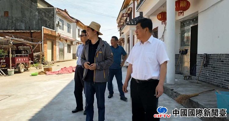 图为宜昌市移民局局长张峻(中)、副局长钱定武(右)市移民局局长刘向阳(左)到王店术店村镇察看移民精准帮扶项目施工进展情况