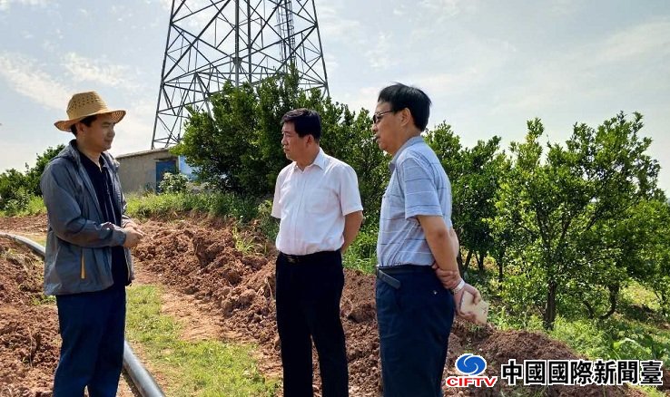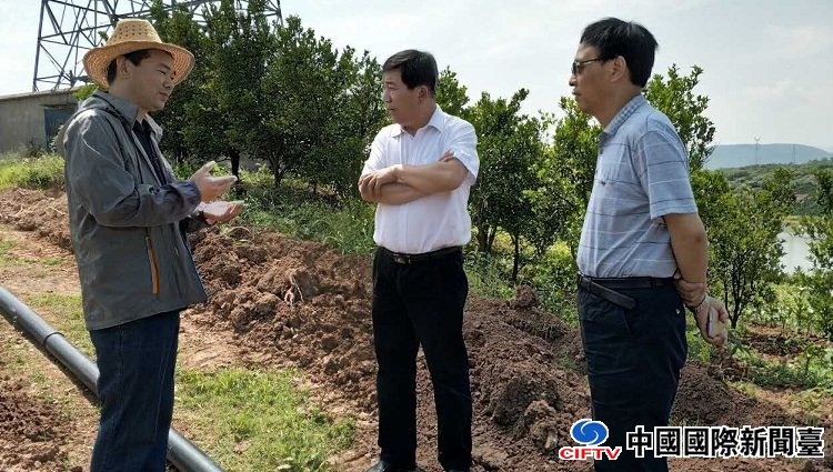 图为宜昌市移民局局长张峻(右)、副局长钱定武(左)市移民局局长刘向阳(中)到当阳市察看移民精准帮扶项目施工进展情况