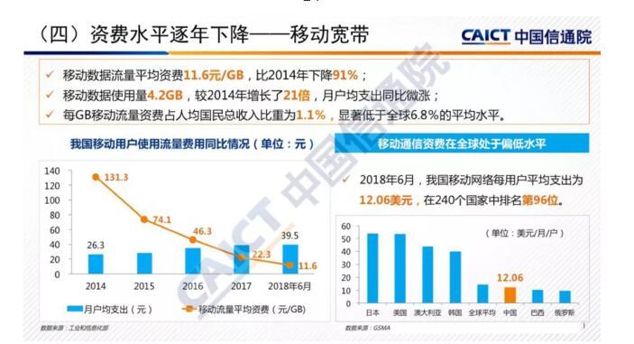 至于目前国内流量资费情况,还处在很高的位置。之前,中国信通院发布的《中国宽带发展白皮书2018》显示,目前中国的移动数据流量平均资费为11.6元/GB,虽然相比2014年的131.3元降幅超91%,但是这依然谈不上便宜,之前中国移动曾表态,将努力把流量降低到每GB 10元以内。