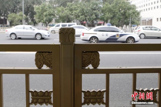 7月18日,北京长安街两侧的新护栏。北京长安街护栏更换工程日前正式开工。新护栏样式提炼了莲花、如意、华板等传统元素,体现了“神州第一街”的风格。护栏通体为不锈钢材质,由柱头、莲花、如意、基座、底座、华板等72个零部件焊接制成。中新社发 李慧思 摄